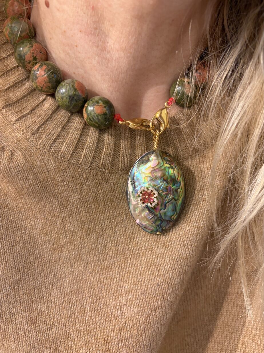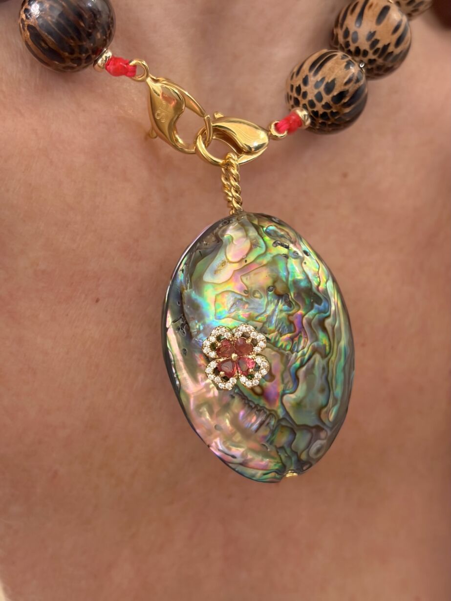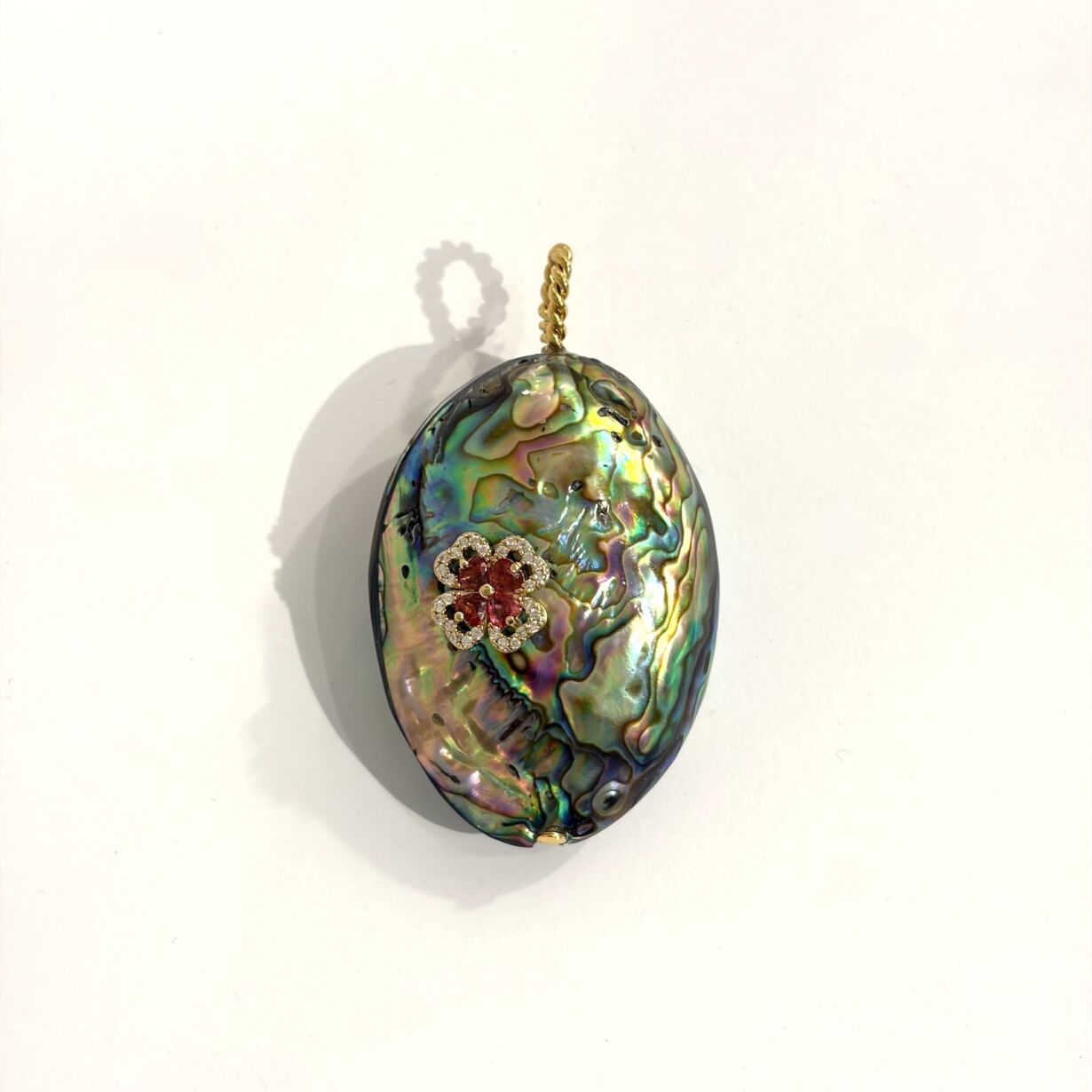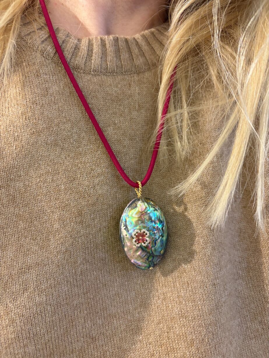 Natural abalone shell pendant set with a pink zircon flower – all plated in 24-karat gold – Each piece is handcrafted in Paris. Original design by Sande Paris.