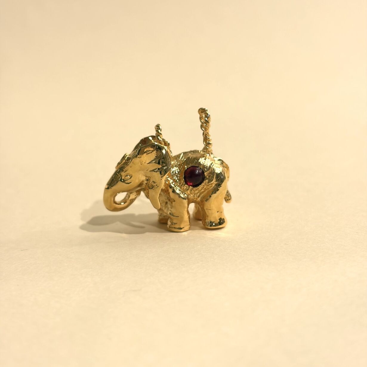 Elephant Pendant – A universal symbol of wisdom, strength, and protection – Original design by Sande Paris, gold plated 24 karat with a semi-precious stone cabochon and our signature heart design.