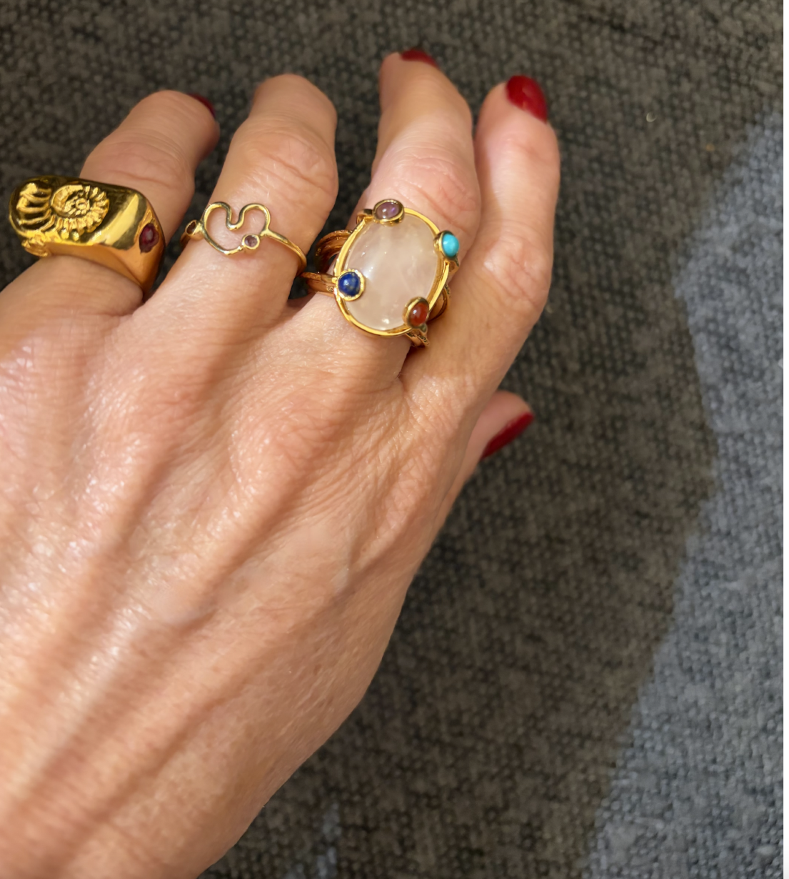 Bague plaqué or – sertie d’un cabochon de pierre semi-précieuse – soit Amazonite – Lapis-Lazuli ou Améthyste – avec notre Coeur Signature.