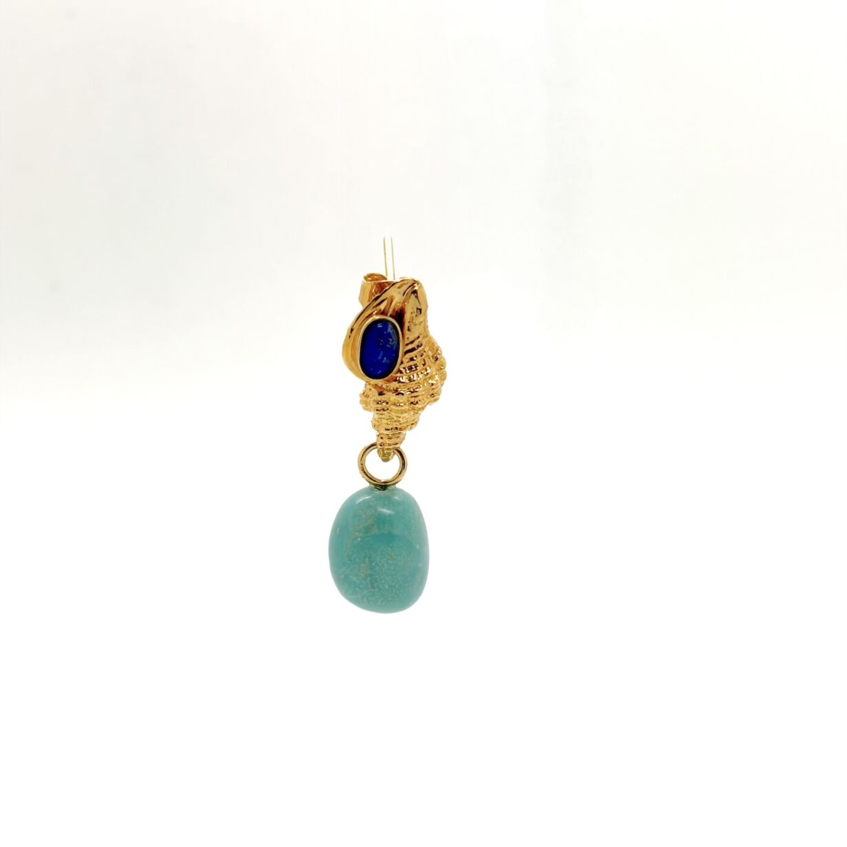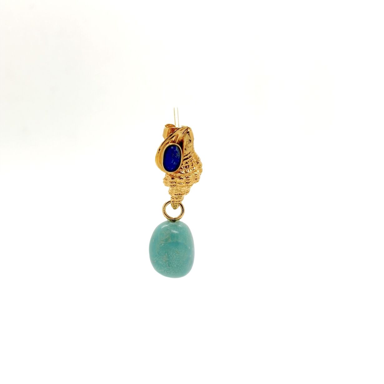 Boucle d’oreille forme coquillage sertie d’un cabochon ovale Lapis Lazuli et pendentif turquoise – le tout doré à l’or 24 carats.