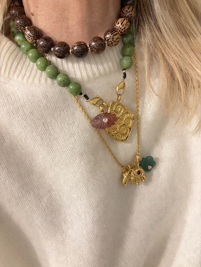 Il peut se porter aussi avec les fermoirs devant, et y ajouter nos pendentifs.