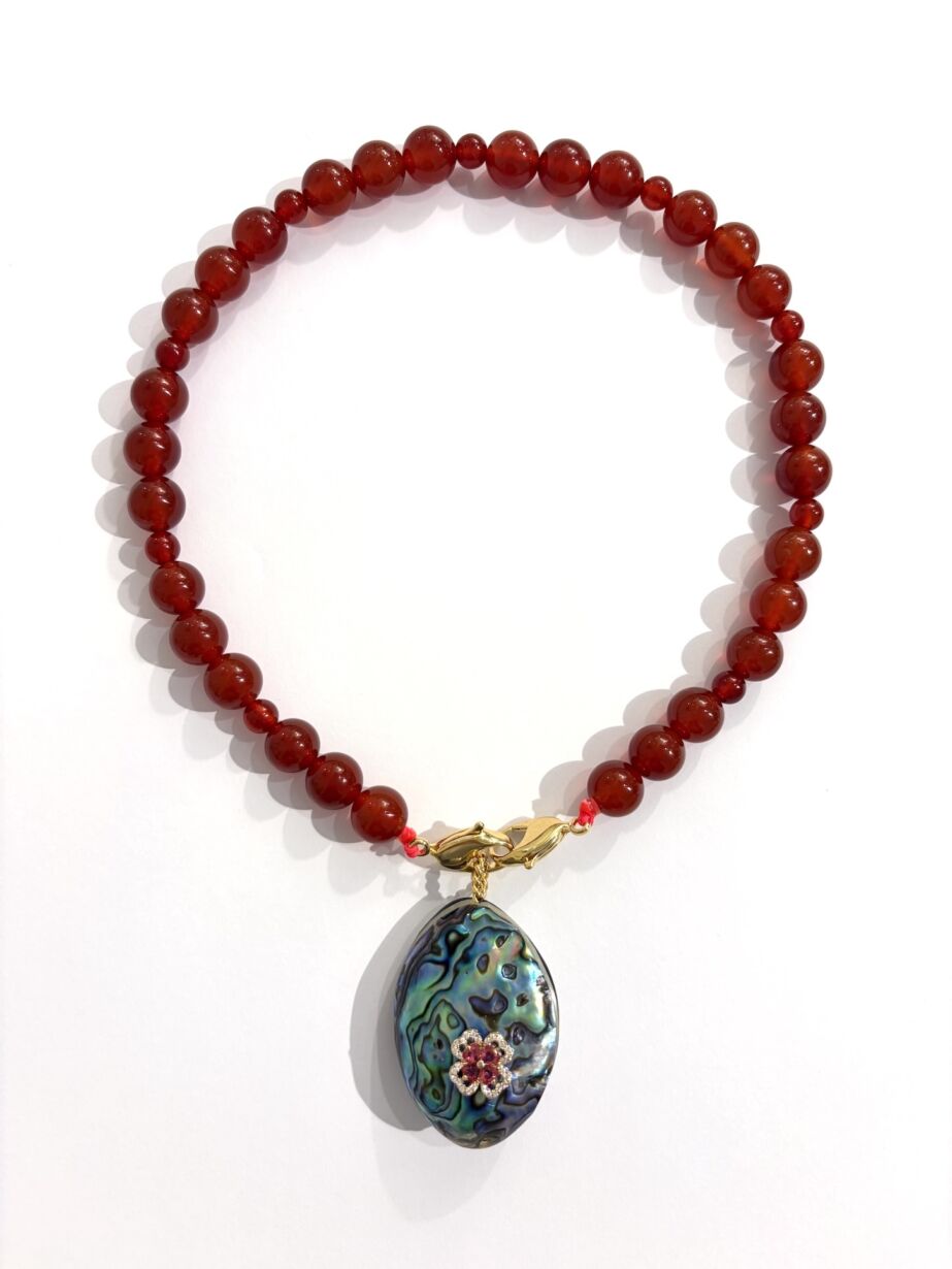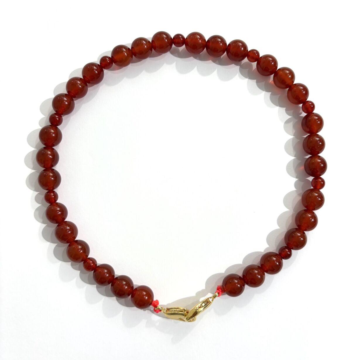 Collier composé de perles rondes de Cornaline, avec 2 fermoirs dorés à l’or 24 carats.