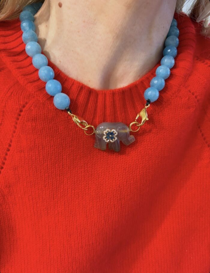 Collier en perle de Quartz bleu et son Pendentif forme éléphant en Agate naturelle, serti d’une fleur en zircon.