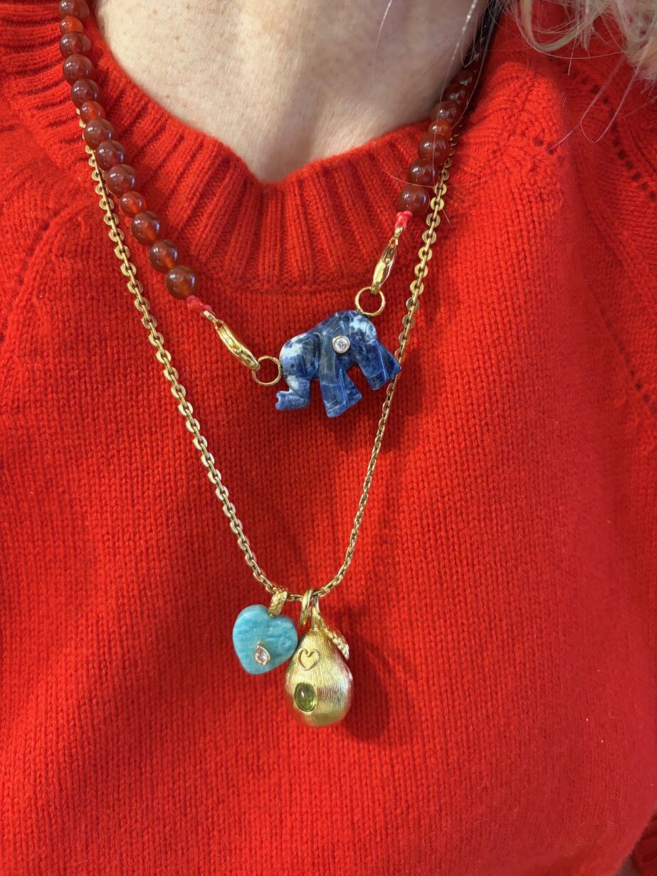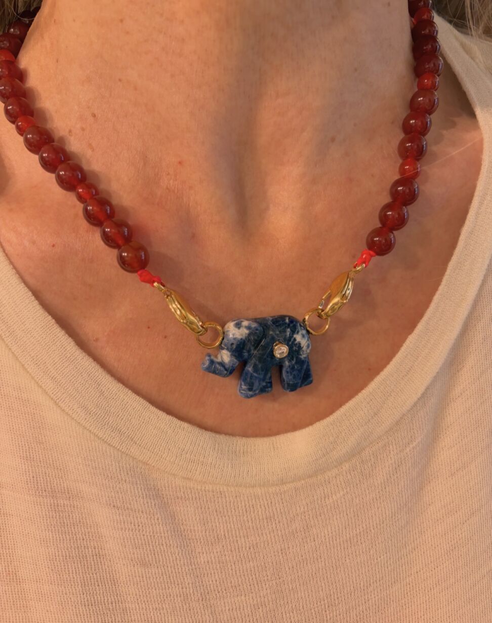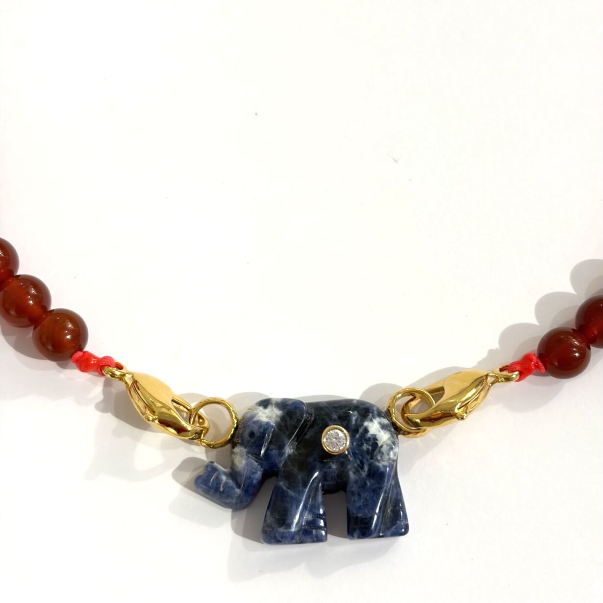 collier en perle de Cornaline et son Pendentif forme éléphant en Sodalite serti d’un zircon rond, avec 2 fermoirs dorés à l’or 24 carats.