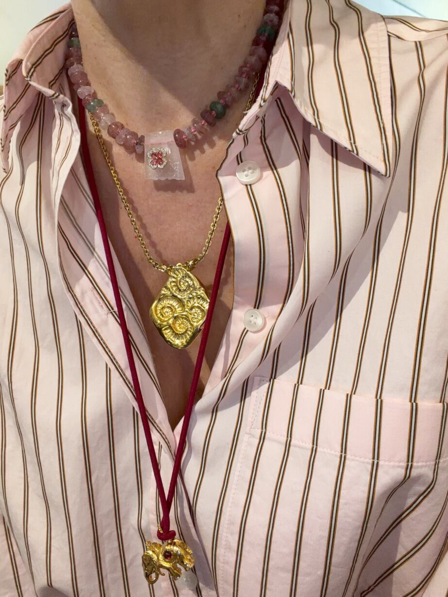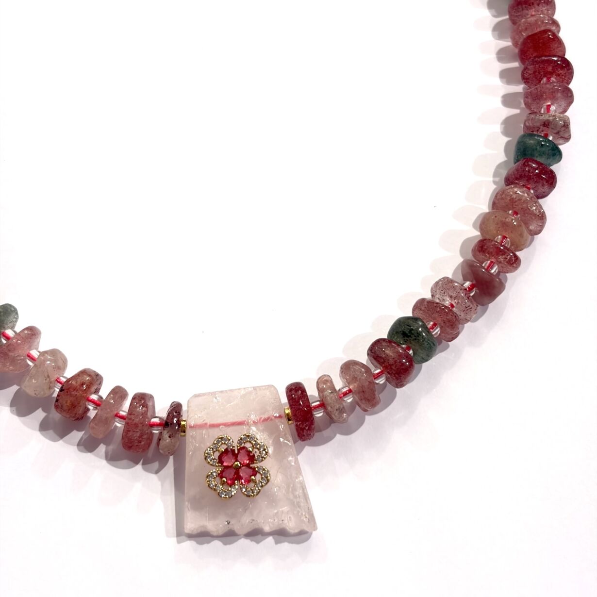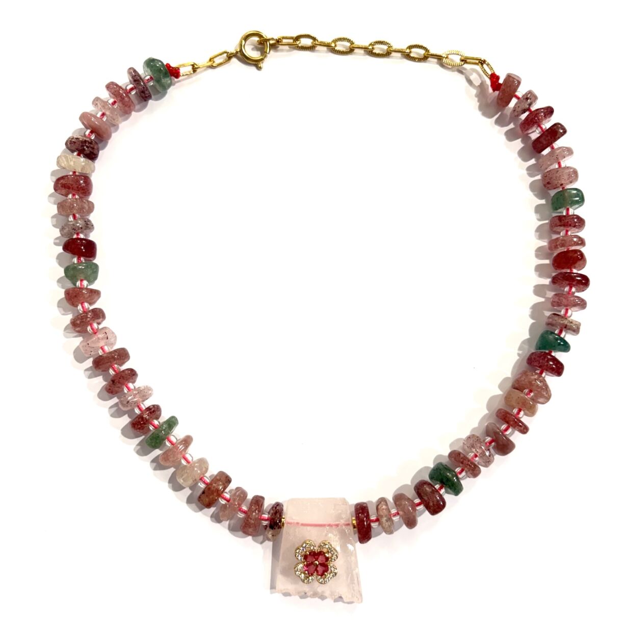 Collier composé de pierres de Quartz Fraise et en son centre un Quartz Rose brut serti d’une fleur en zircon – Chaine dorée à l’or 24 carats.