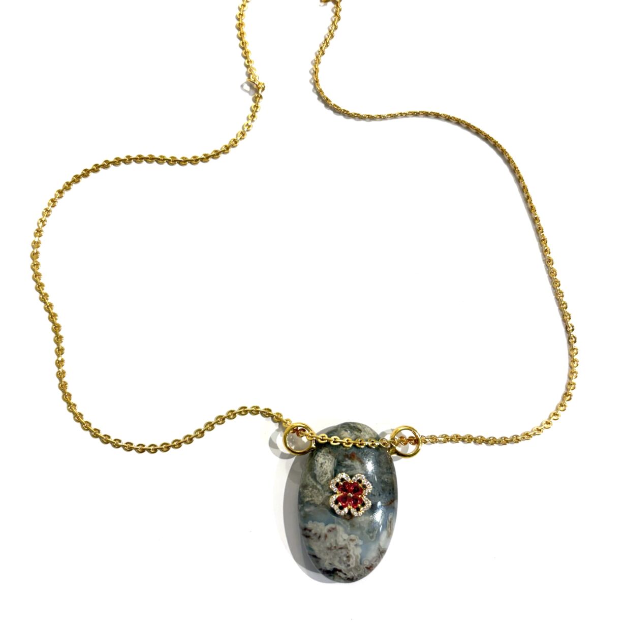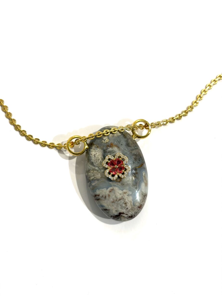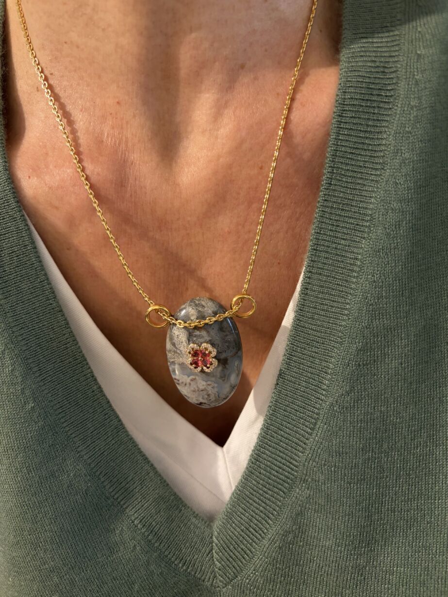 Collier chaine et son pendentif en Agate naturelle sertie d’une fleurs en zircon – doré à l’or 24 carats.