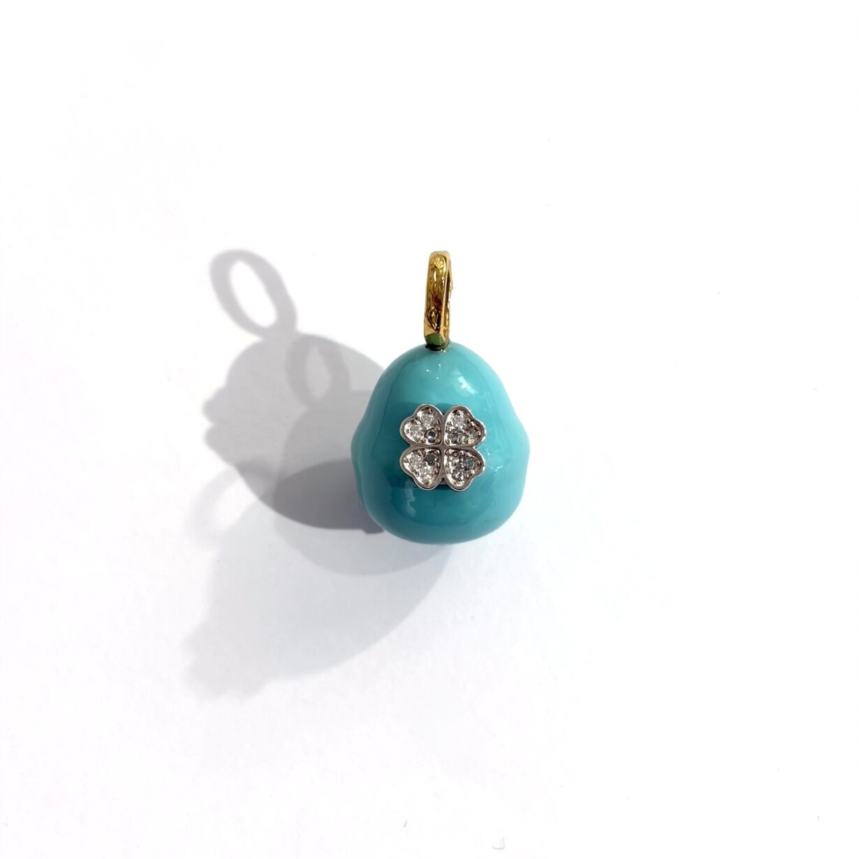 Pendentif en nacre teintée bleue forme poire, serti d’un trèfle en zircon argent – Anneau doré à l’or 24 carats.