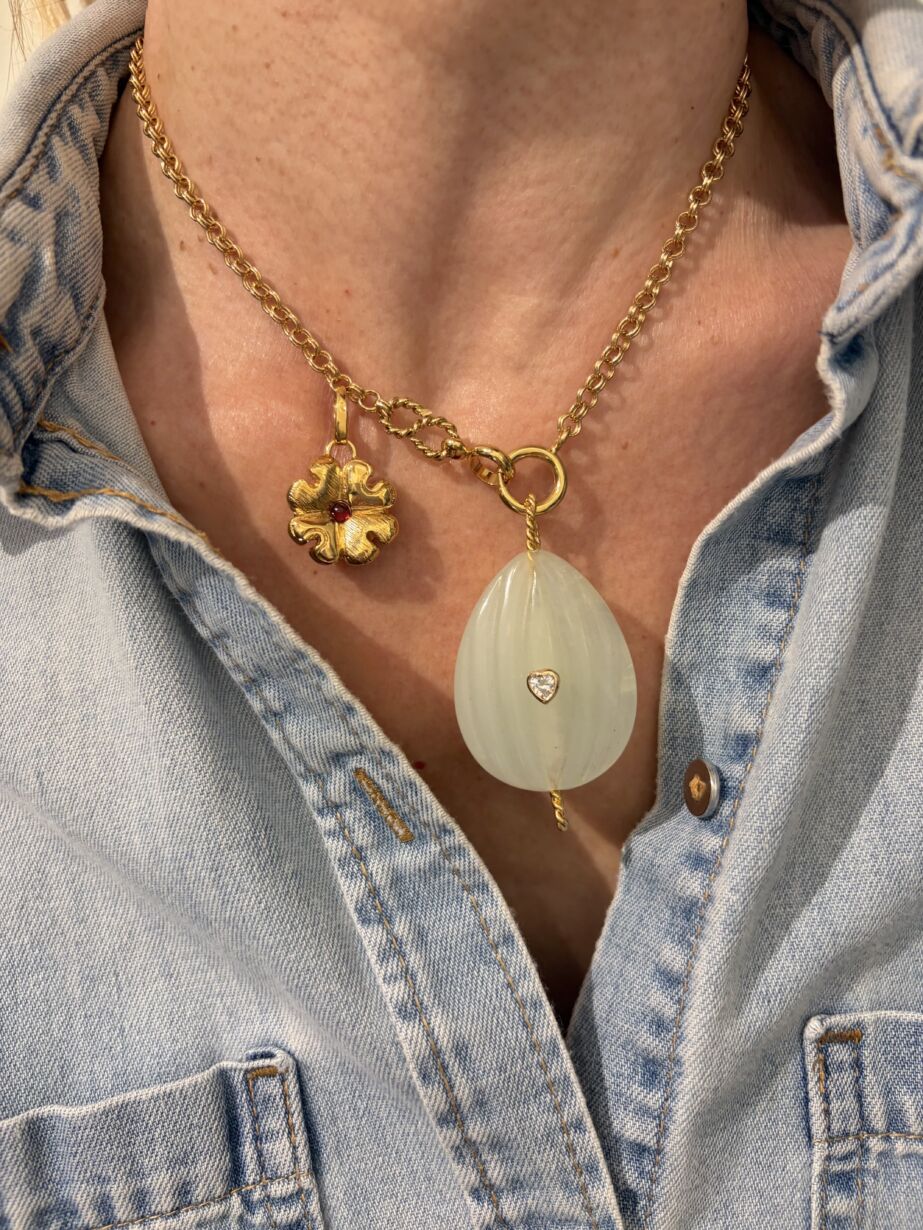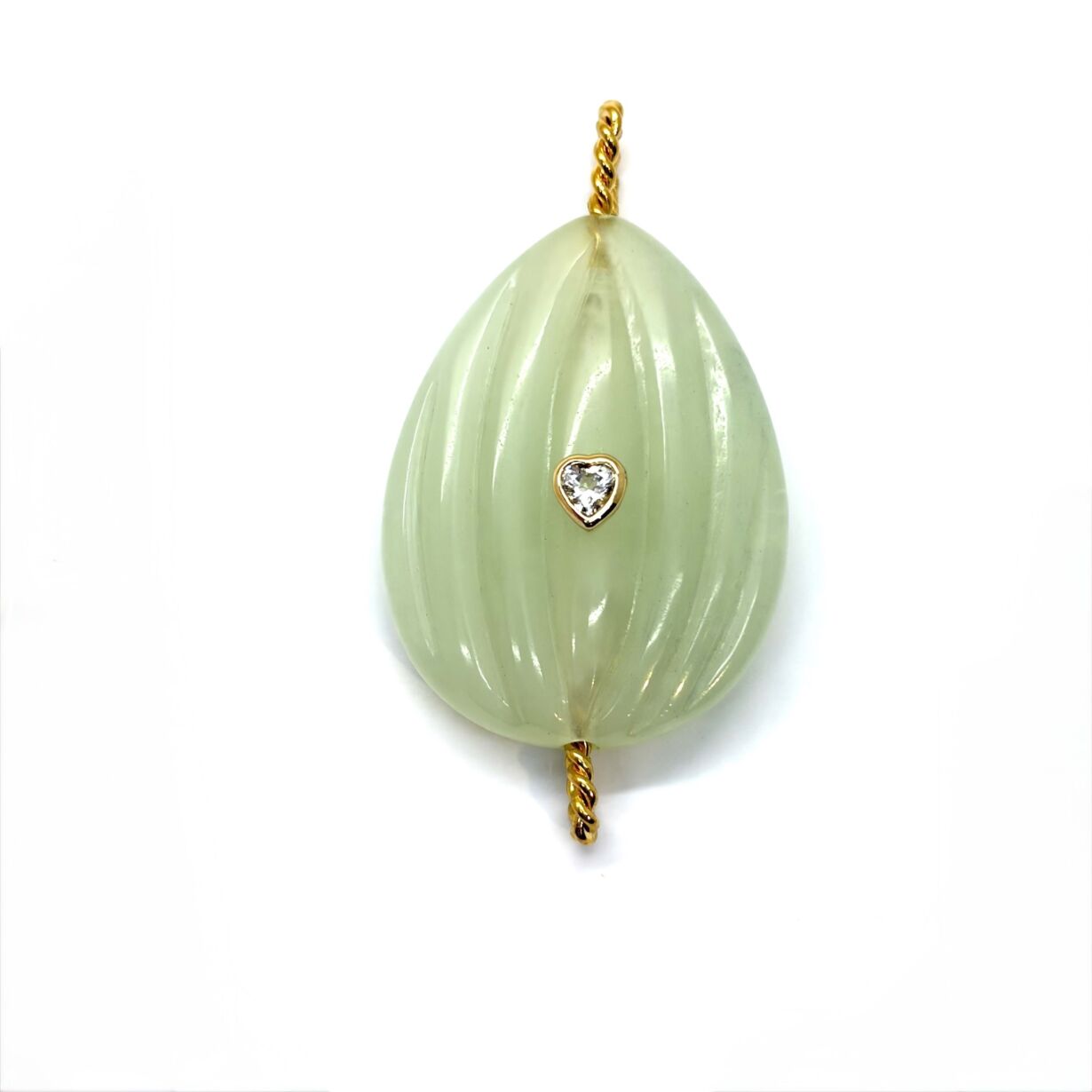 Pendentif pour collier en Jade vert clair ovale sertie d’un zircon blanc, avec un anneau torsadé doré à l’or 24 carats.